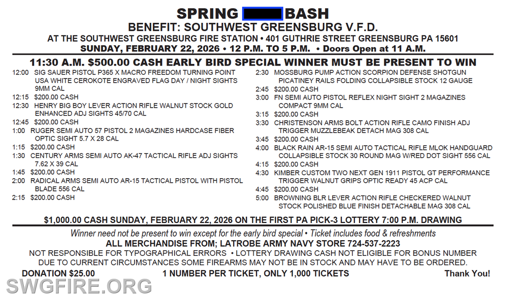 | The Southwest Greensburg Volunteer Fire Department is proud to host our Spring Gun Bash, a fundraising event supporting our department.