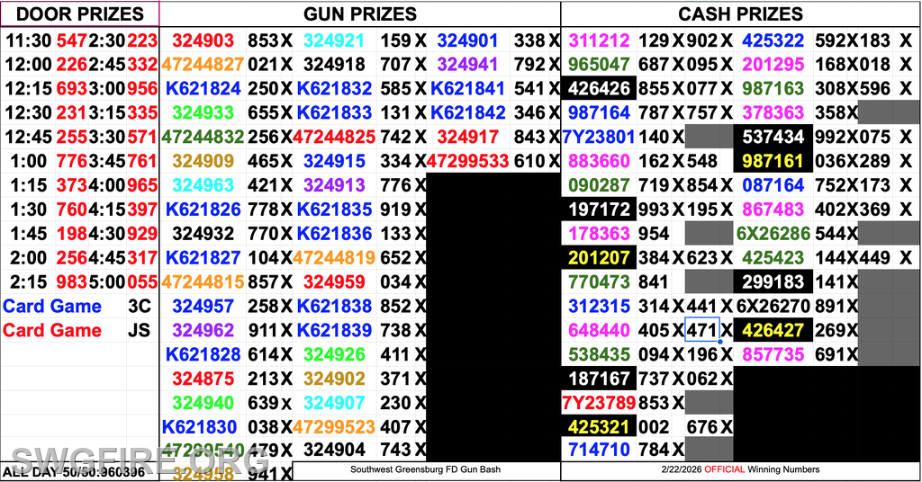 | The Southwest Greensburg Volunteer Fire Department would like to sincerely thank everyone who supported our Spring Gun Bash held on Sunday, February 22, 2026.
