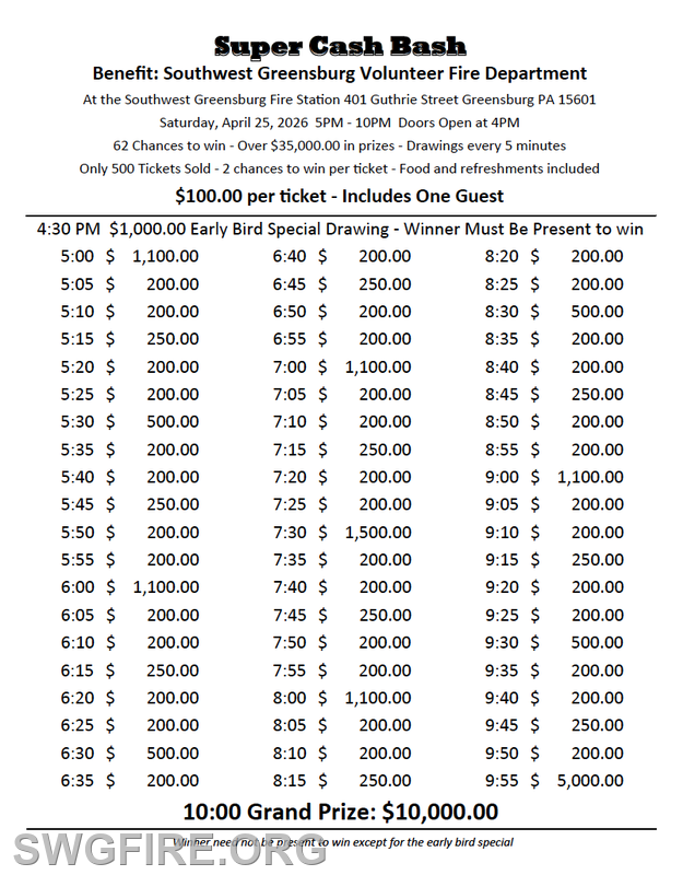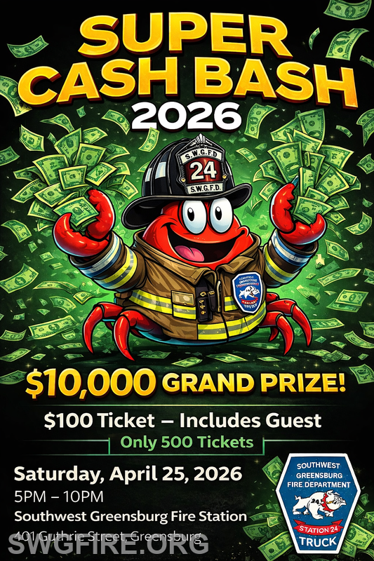 | The Southwest Greensburg Volunteer Fire Department is excited to announce that tickets are now on sale for our 2026 Super Cash Bash. This annual fundraising event helps support equipment purchases, training, and operational needs that allow us to continue serving our community at the highest level.